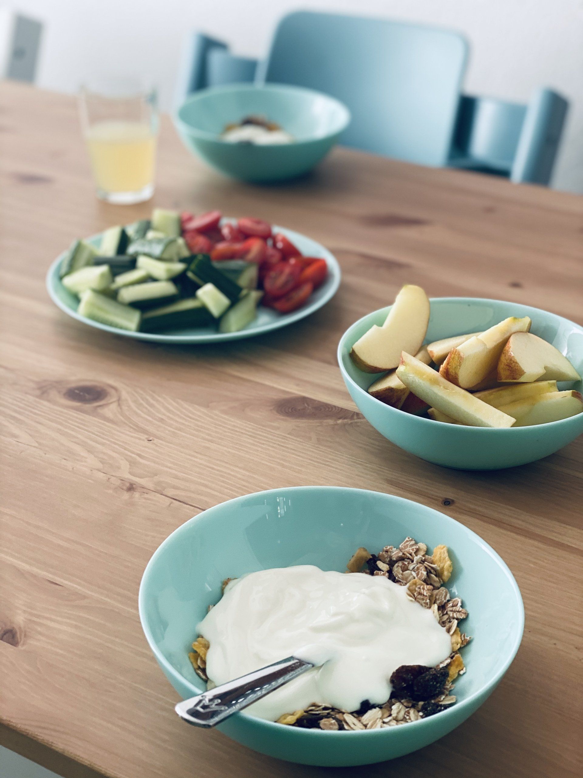 Wir bieten den Kindern viele verschiedene Lebensmittel an. Es gibt Rohkost, wie Gurken, Tomaten und Karotten, ebenso wie alles Mögliche an Obst. Darauf haben die Kinder jederzeit Zugriff.